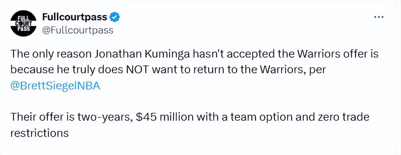 库明加至今拒绝这份合同的唯一原因,就是他“真心不想回到勇士”。若想让他回心转意、双方达成和解,勇士队的两年期提案必须优先考虑“满足库明加的核心诉求”——但目前来看,这份提案几乎没有调整的可能。